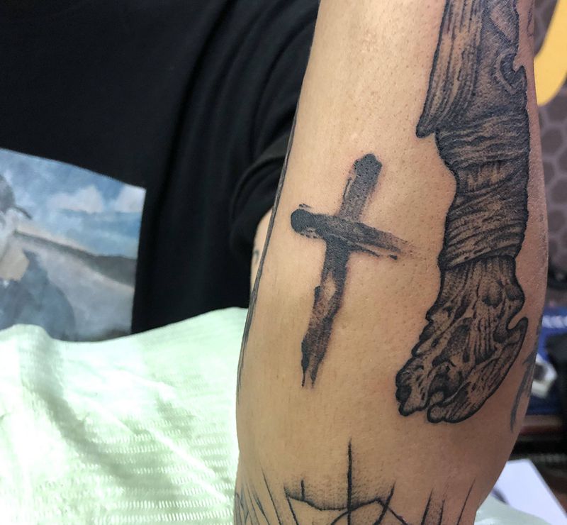 当前位置: 首页 >广东省湛江市纹身店-蜕变过程·墨·纹身工作室纹身图案>拼接十字架纹身图片_手臂Old SchoolNew School纹身图案