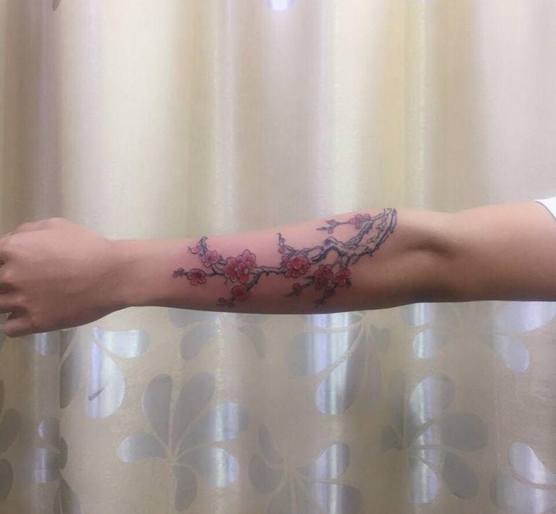 当前位置: 首页 >广东省江门市纹身店-浪刺青纹身工作室纹身图案>梅花纹身图片_成品手臂清新传统国画植物纹身图案