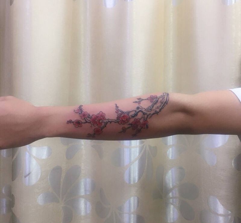 当前位置: 首页 >广东省江门市纹身店-浪刺青纹身工作室纹身图案>梅花纹身图片_成品手臂清新传统国画植物纹身图案