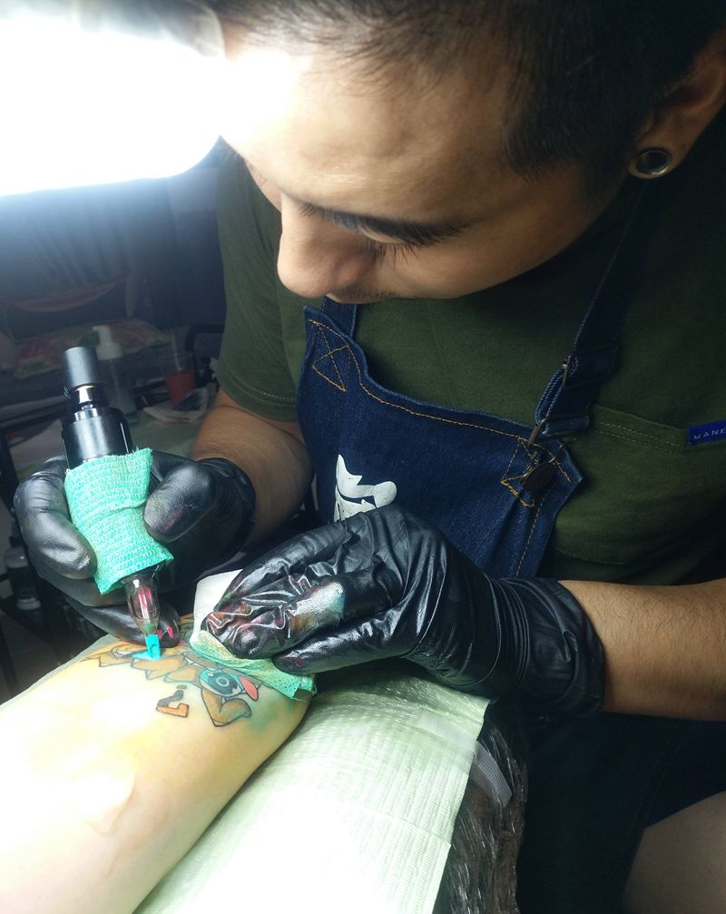 • T包小腿吹火男+阿多福纹身图片_腿部老传统新传统吹火男阿