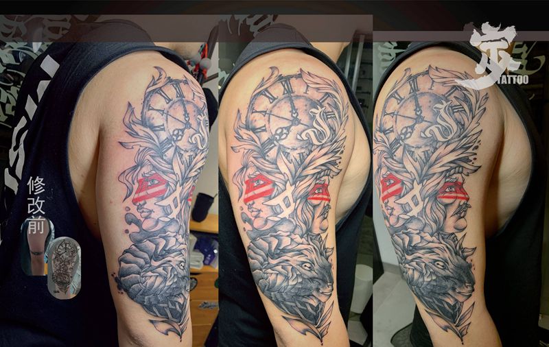 当前位置: 首页 >广东省湛江市纹身店-宁少TATTOO纹身图案>遮盖➕时钟双子羊纹身图片_手臂New School纹身图案