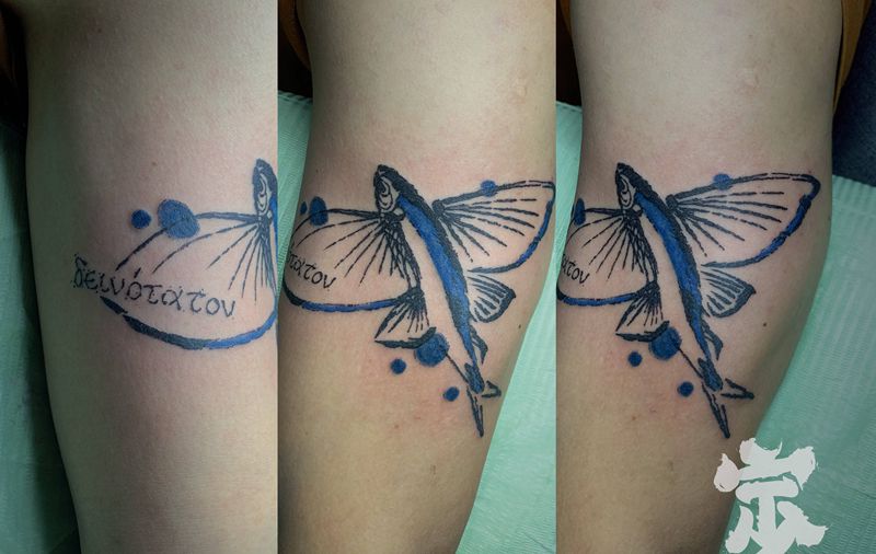 当前位置: 首页 >广东省湛江市纹身店-宁少TATTOO纹身图案>飞鱼+ δεινότατον纹身图片_手臂水墨New School纹身图案