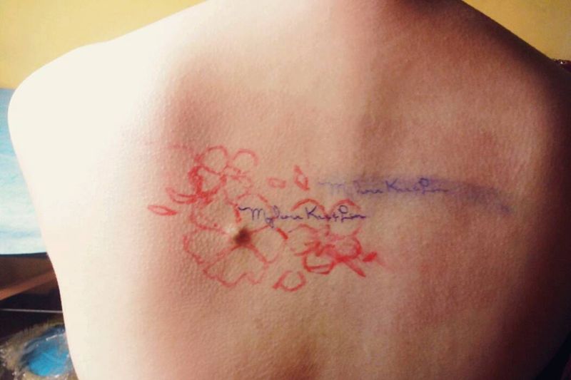 原创小花+签名=遮盖小豆豆纹身图片_背部清新字符植物原创覆盖成品纹身图案