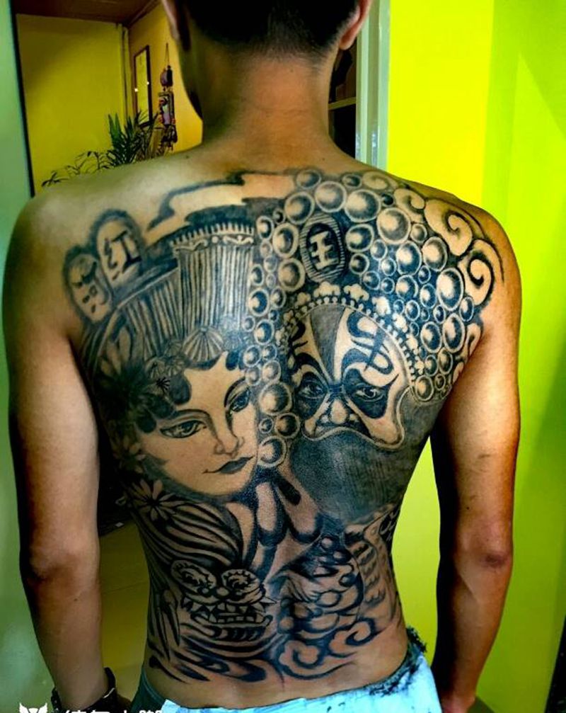当前位置: 首页 >广东省湛江市纹身店-宁少TATTOO纹身图案>霸王别姬+手绘满背纹身图片_背部传统肖像国画人物成品纹身图案
