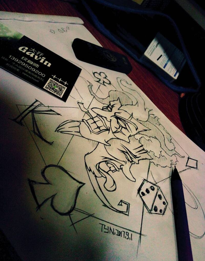 当前位置: 首页 >广东省湛江市纹身店-宁少TATTOO纹身图案>创作手稿+小丑纹身图片_胸部背部手臂腿部欧美原创抽象手稿纹身图案