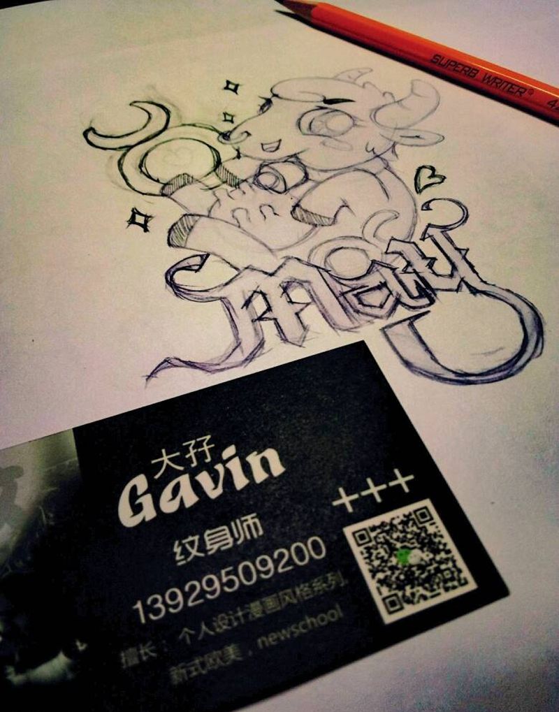 金牛座可爱手稿设计纹身图片_手臂腿部欧美动物日式漫画手绘手稿纹身图案