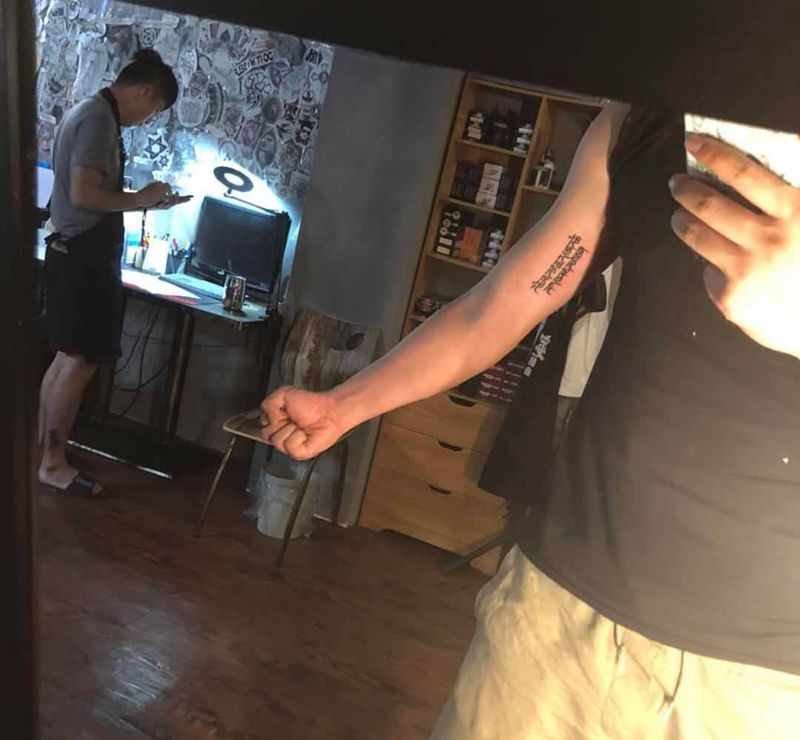 当前位置: 首页 >广东省湛江市纹身店-宁少TATTOO纹身图案>梵文纹身图片_成品手臂清新字符习俗纹身图案