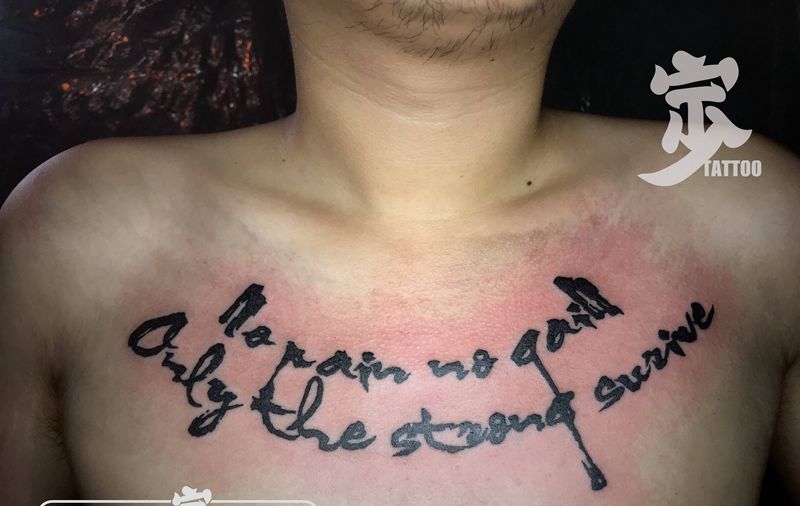 当前位置: 首页 >广东省湛江市纹身店-宁少TATTOO纹身图案>毛笔字+英文纹身图片_胸部花体字水墨纹身图案