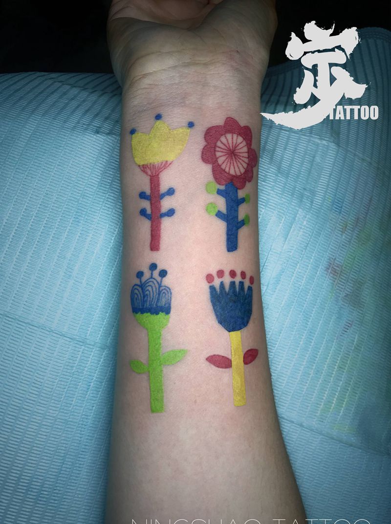 当前位置: 首页 >广东省湛江市纹身店-宁少TATTOO纹身图案>草间弥生的4朵小花纹身图片_手臂几何图腾花纹身图案