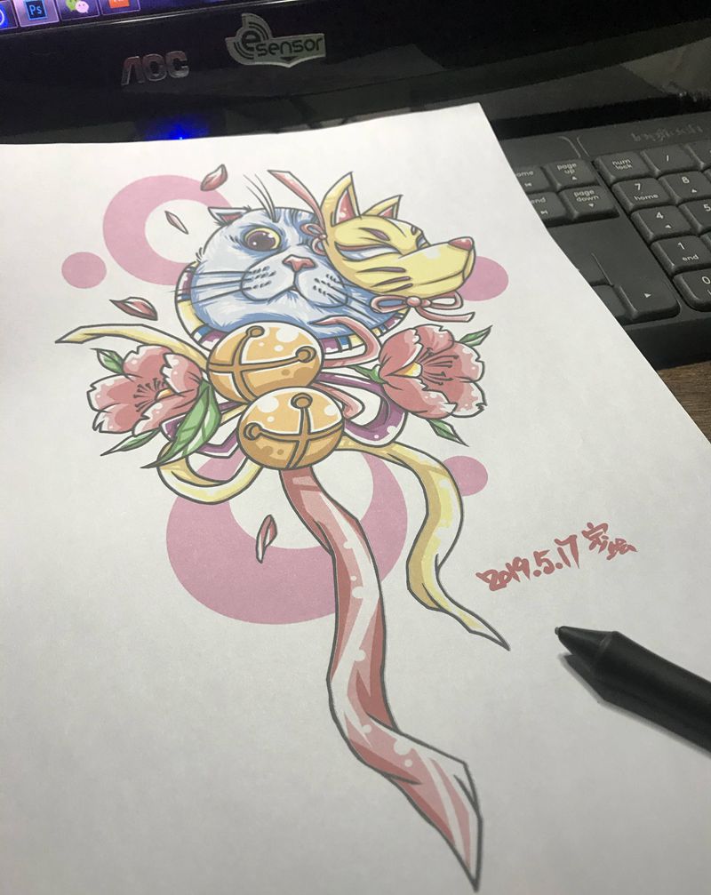 日式猫+覆盖纹身图片_手臂新传统New School纹身图案