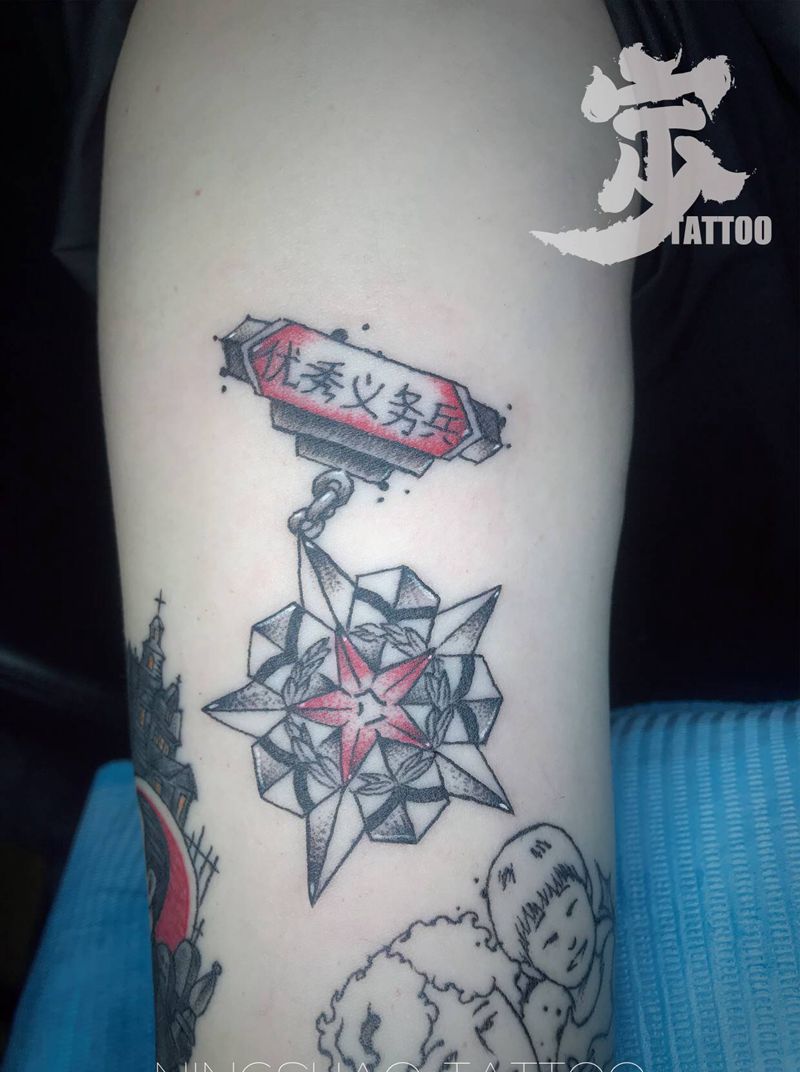 当前位置: 首页 >广东省湛江市纹身店-宁少TATTOO纹身图案>优秀义务兵勋章纹身图片_手臂New School点刺纹身图案