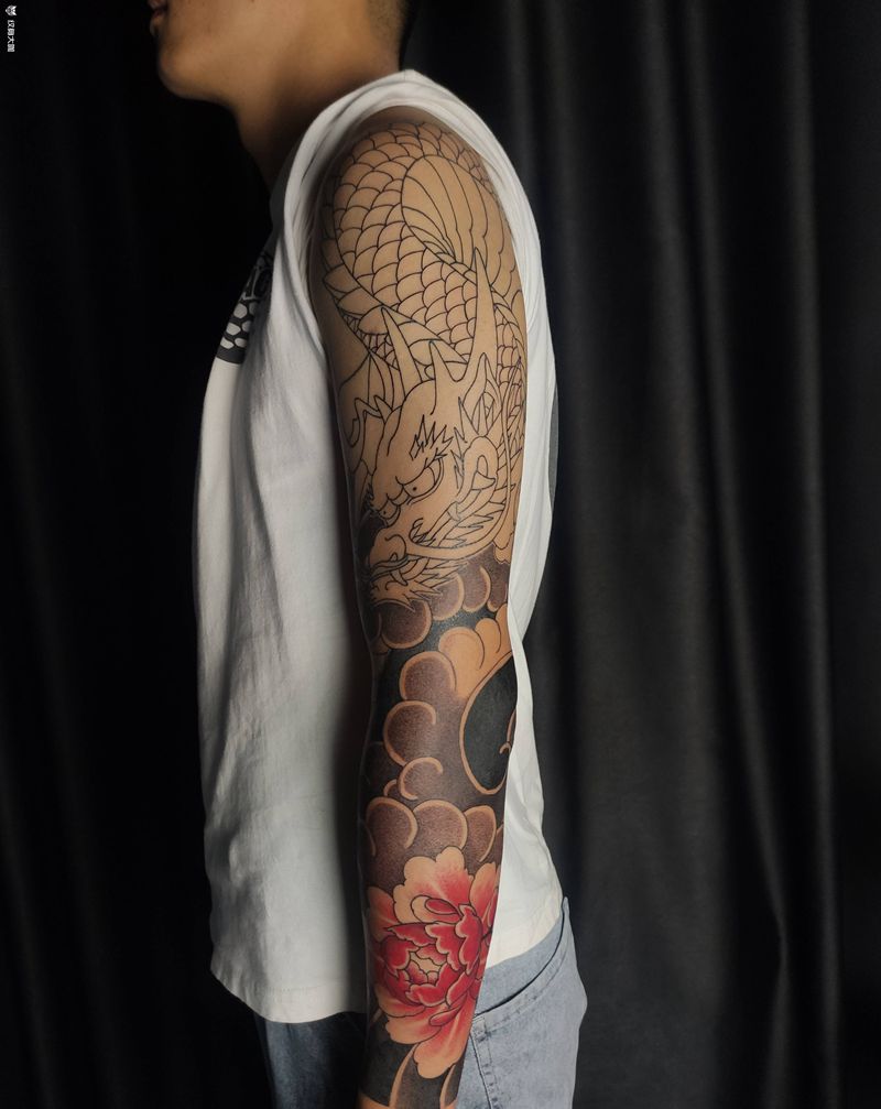• T网红王老大花腿龙纹身图片_腿部新传统纹身图案