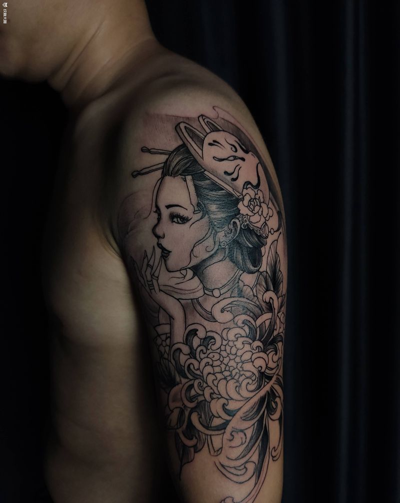 当前位置: 首页 >广东省江门市纹身店-侯刺青纹身工作室纹身图案>艺伎纹身图片_臀部肩部新传统New School纹身图案