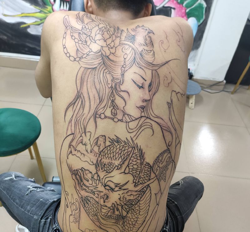 当前位置: 首页 >广东省江门市纹身店-侯刺青纹身工作室纹身图案>满背龙妓纹身图片_背部新传统纹身图案