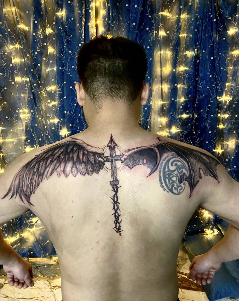 当前位置: 首页 >广东省江门市纹身店-匠奉刺青纹身图案>天使恶魔之翼纹身图片_背部欧美写实纹身图案