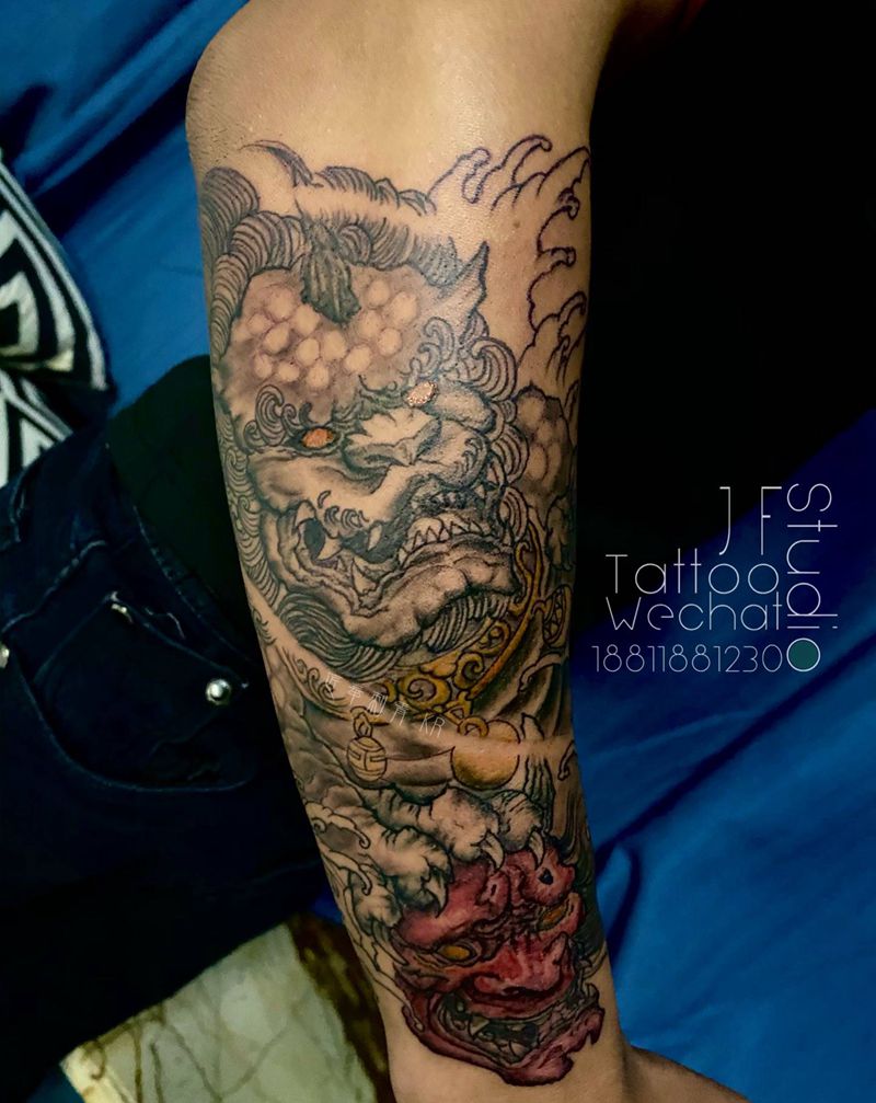 当前位置: 首页 >广东省江门市纹身店-匠奉刺青纹身图案>唐狮子纹身图片_手臂新传统纹身图案