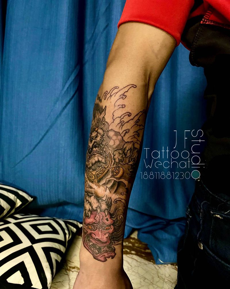 当前位置: 首页 >广东省江门市纹身店-匠奉刺青纹身图案>唐狮子纹身图片_手臂新传统纹身图案
