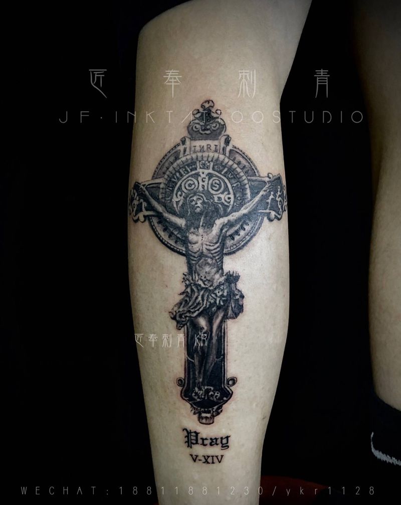 当前位置: 首页 >广东省江门市纹身店-匠奉刺青纹身图案>耶稣纹身图片_腿部欧美写实纹身图案