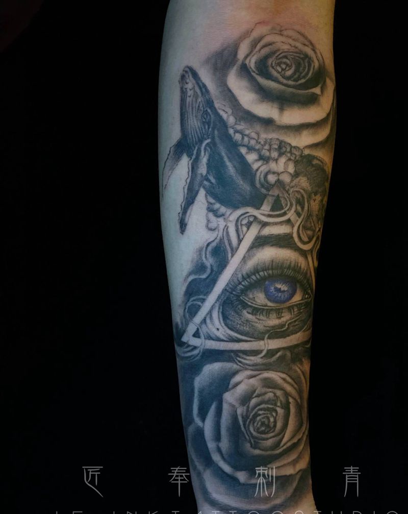 鲸鸣上帝之眼玫瑰纹身图片_手臂欧美写实纹身图案