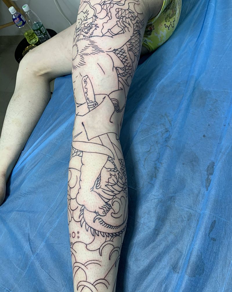 • T网红王老大花腿龙纹身图片_腿部新传统纹身图案