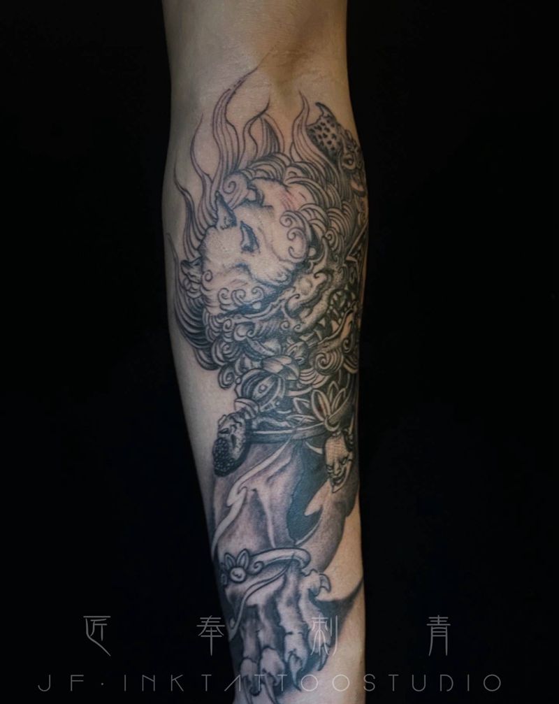 当前位置: 首页 >广东省江门市纹身店-匠奉刺青纹身图案>唐狮子纹身图片_手臂新传统纹身图案