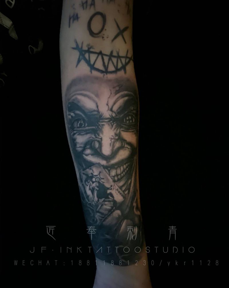 当前位置: 首页 >广东省江门市纹身店-匠奉刺青纹身图案>小丑纹身图片_手臂欧美写实纹身图案