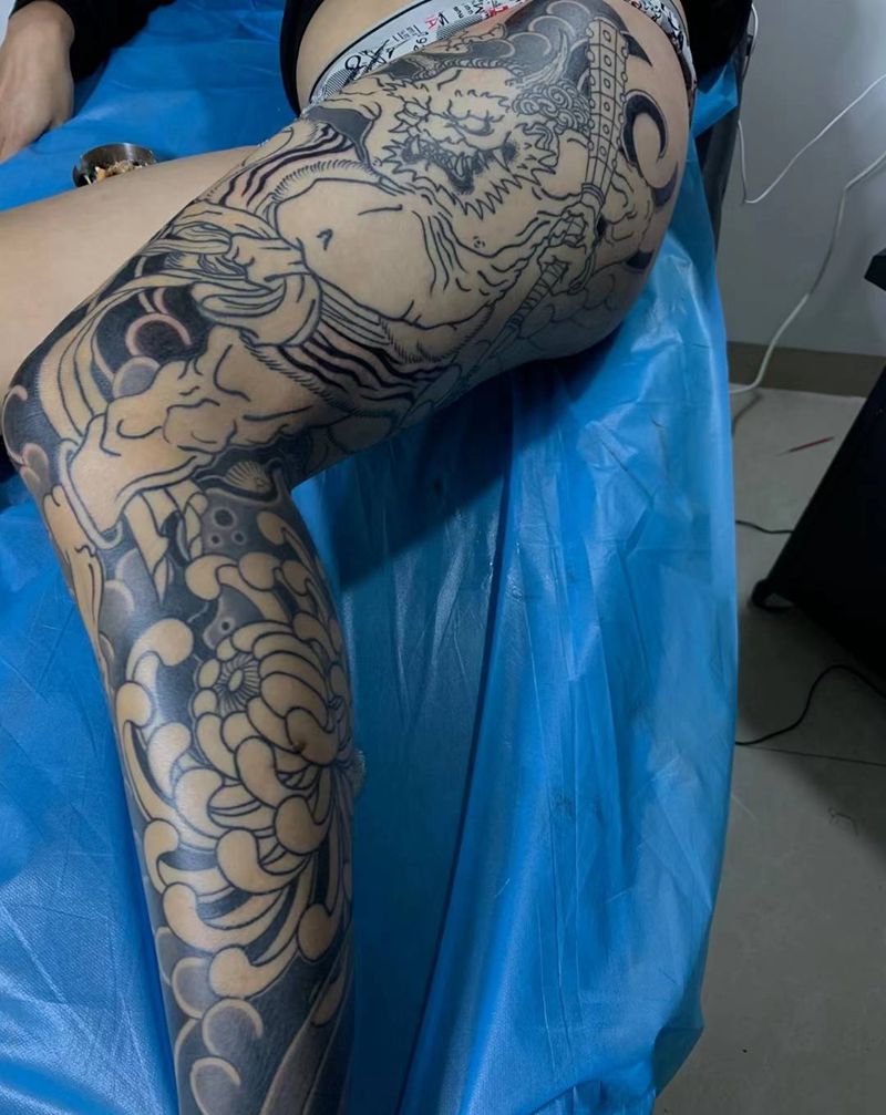 • T网红王老大花腿龙纹身图片_腿部新传统纹身图案