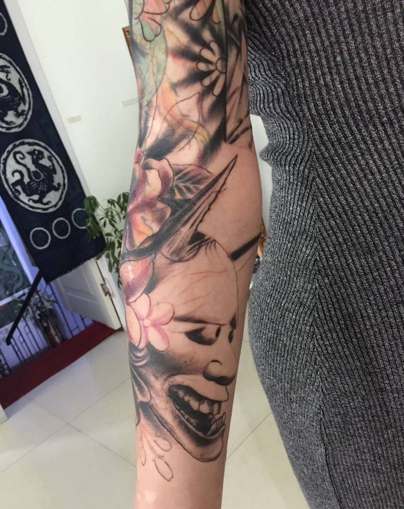 当前位置: 首页 >广东省湛江市纹身店-家文刺青Tattoo纹身图案>全彩色遮盖待续!小臂外侧那字随笔纹身图片