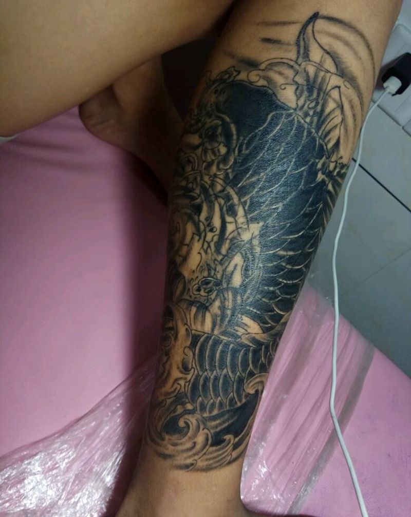 • T网红王老大花腿龙纹身图片_腿部新传统纹身图案