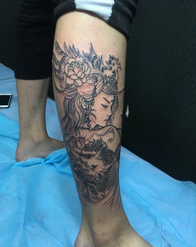 • T网红王老大花腿龙纹身图片_腿部新传统纹身图案