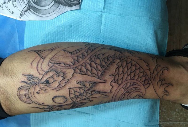 • T网红王老大花腿龙纹身图片_腿部新传统纹身图案