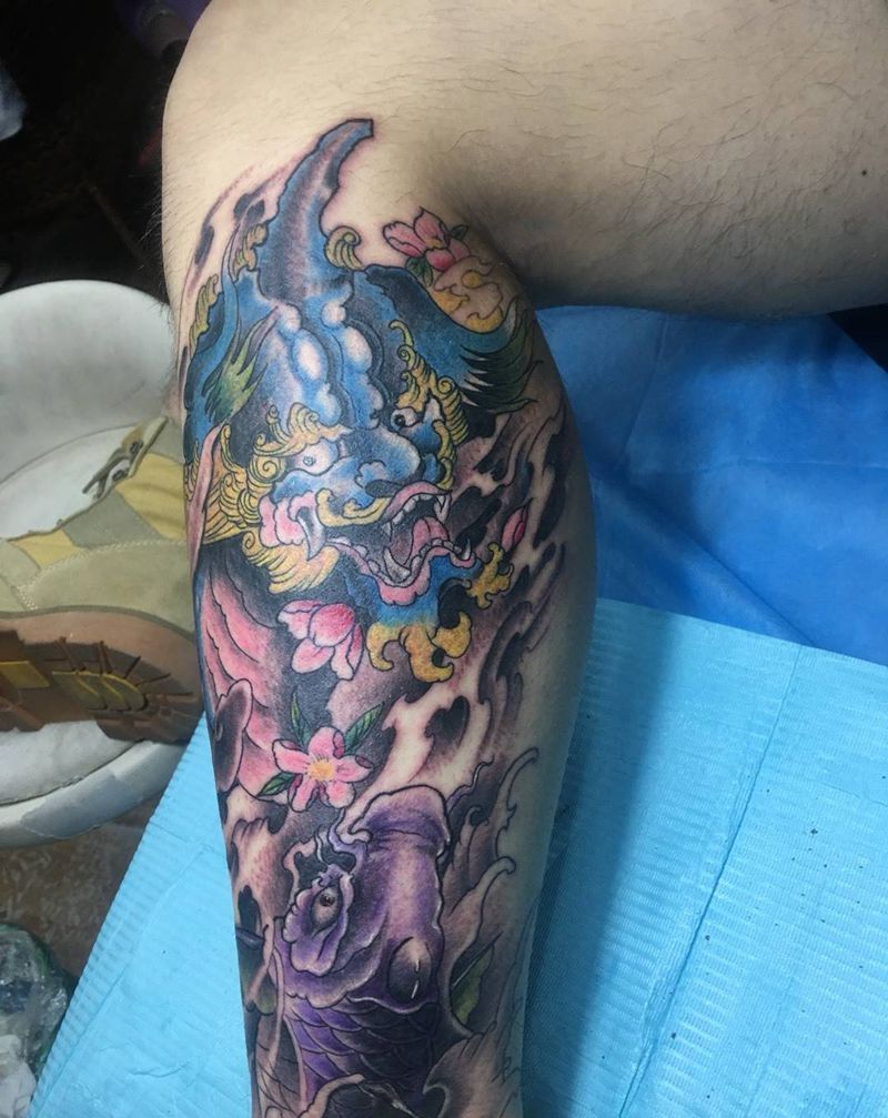 • T网红王老大花腿龙纹身图片_腿部新传统纹身图案