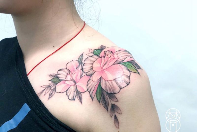 彩色素花纹身图片_肩部花卉纹身图案