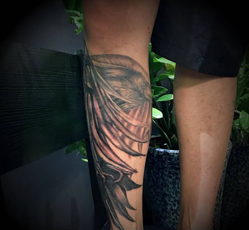 • T网红王老大花腿龙纹身图片_腿部新传统纹身图案