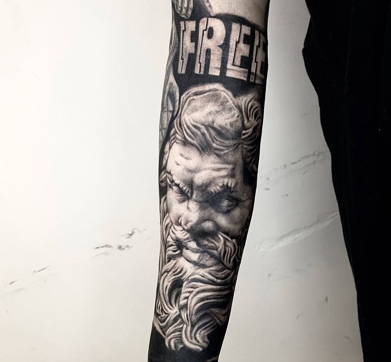 宙斯石膏花臂纹身图片_手臂欧美写实纹身图案