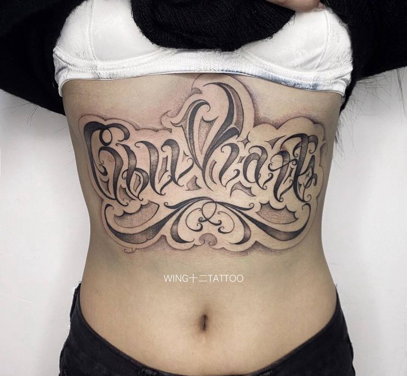 花体字遮盖纹身图片_腹部花体字纹身图案