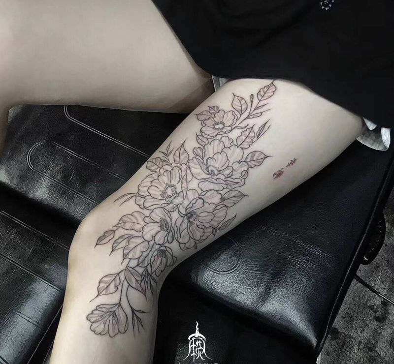 国风-素花纹身图片_腿部老传统素花纹身图案