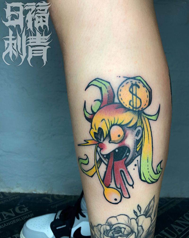 • T包小腿吹火男+阿多福纹身图片_腿部老传统新传统吹火男阿