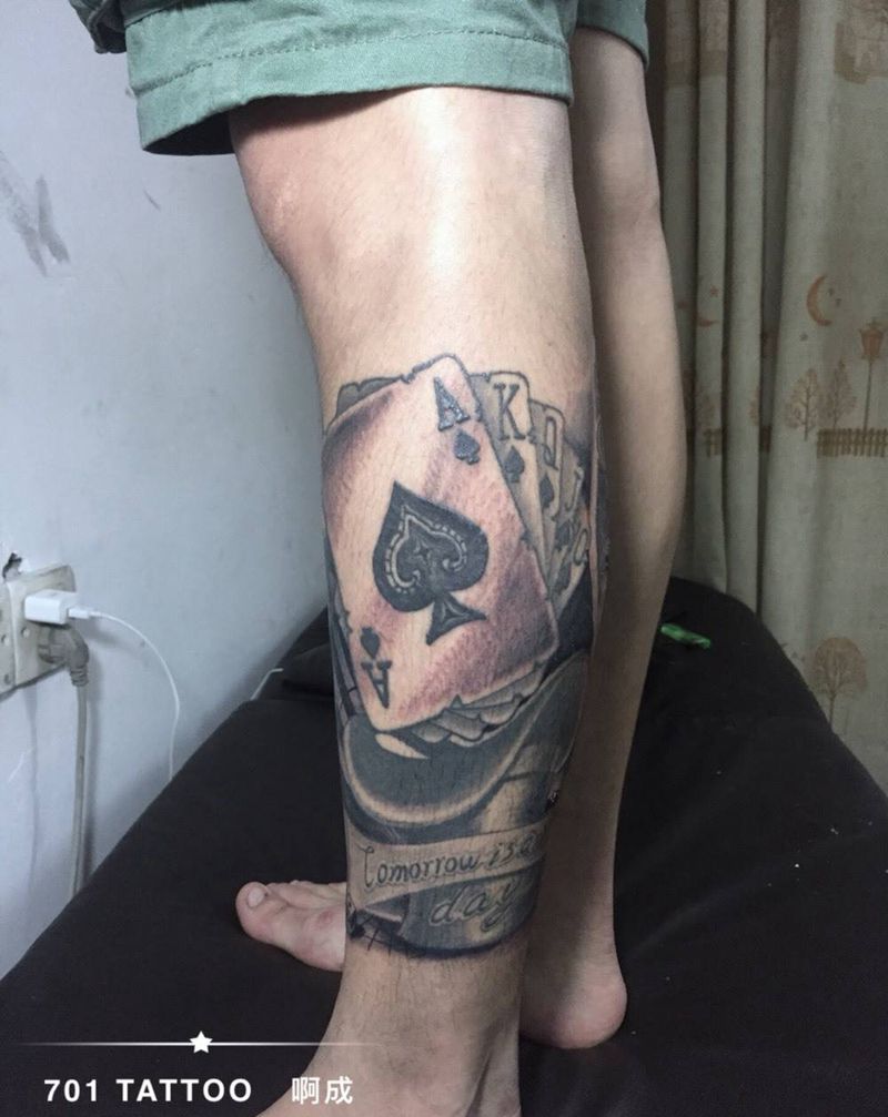 当前位置: 首页 >广东省肇庆市纹身店-日福刺青纹身图案>欧美赌场风拼小腿纹身图片