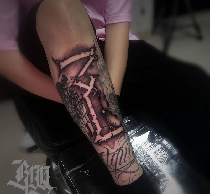 哥特花体字「L」纹身图片_脚部欧美写实花体字纹身图案