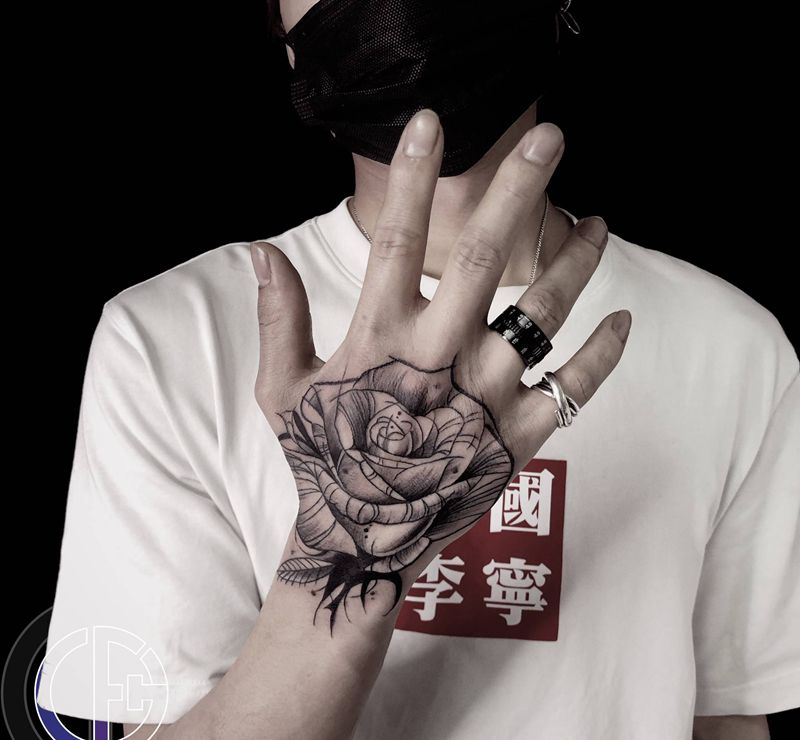 • 手背潮流时尚的玫瑰花眼睛纹身图案