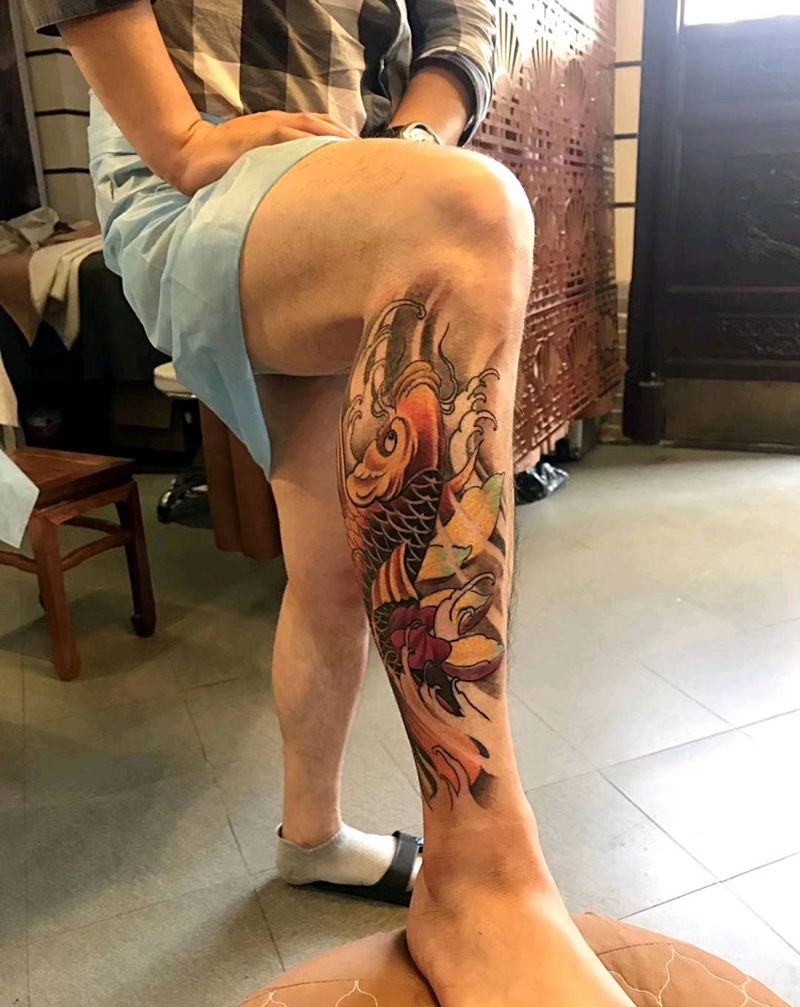 • T网红王老大花腿龙纹身图片_腿部新传统纹身图案