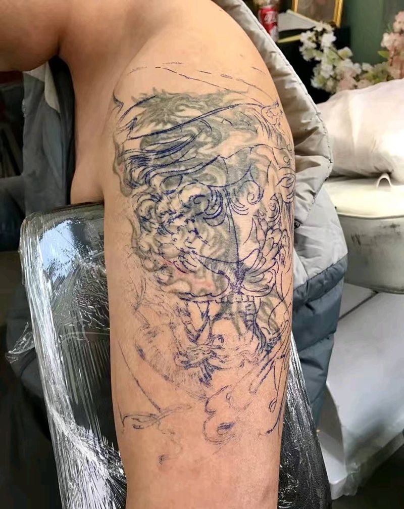 • T网红王老大花腿龙纹身图片_腿部新传统纹身图案