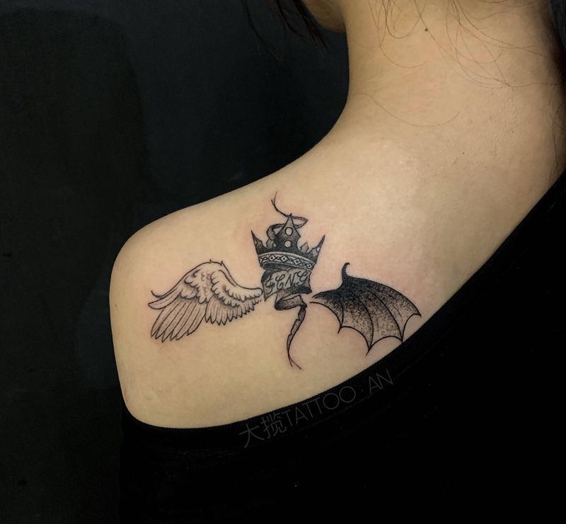 当前位置: 首页 >广东省惠州市纹身店-大揽刺青纹身图案>天使与恶魔纹身图片_肩部纹身图案
