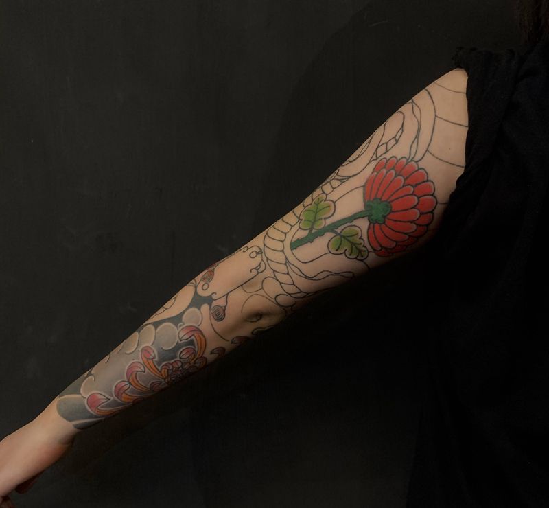 当前位置: 首页 >广东省惠州市纹身店-大揽刺青纹身图案>传统花臂上色-未完待续纹身图片_手臂新传统纹身图案