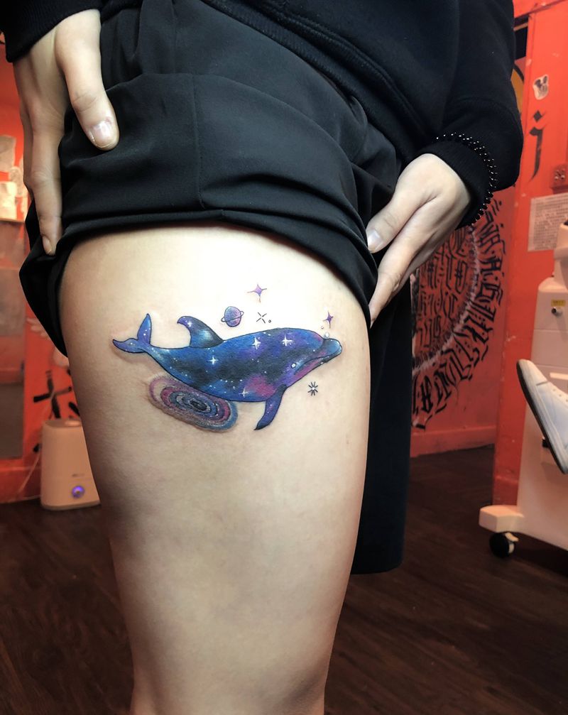 • T网红王老大花腿龙纹身图片_腿部新传统纹身图案
