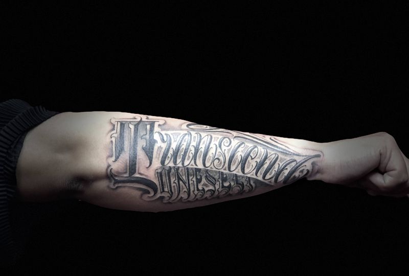 当前位置: 首页 >广东省肇庆市纹身店-黑兔刺青纹身馆纹身图案>英文意思:超越自我纹身图片_手臂花体字纹身图案