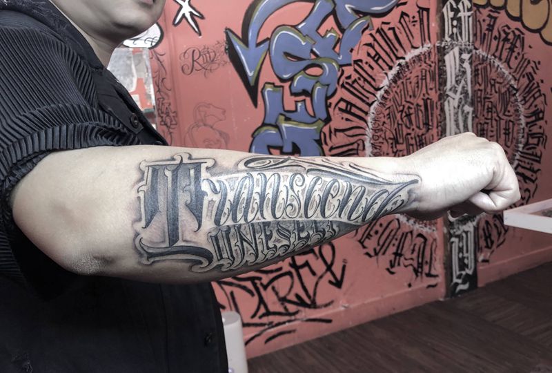 当前位置: 首页 >广东省肇庆市纹身店-黑兔刺青纹身馆纹身图案>英文意思:超越自我纹身图片_手臂花体字纹身图案