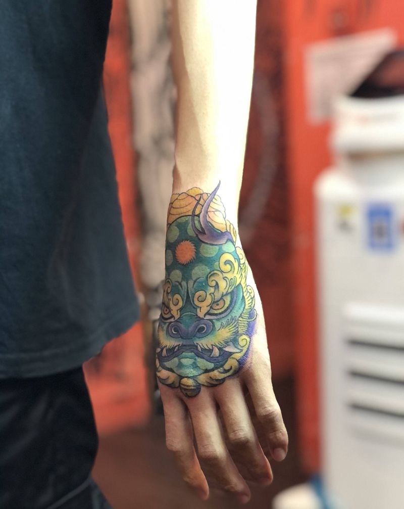 当前位置: 首页 >广东省肇庆市纹身店-黑兔刺青纹身馆纹身图案>唐狮三百首纹身图片_手部新传统纹身图案