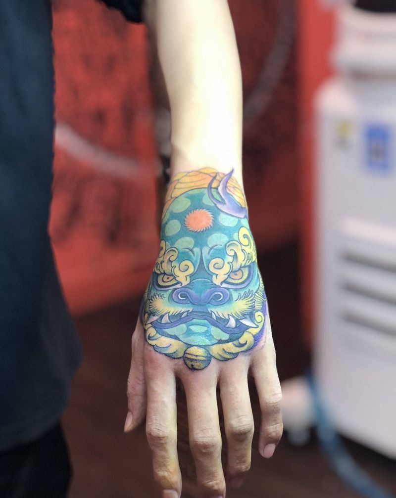 当前位置: 首页 >广东省肇庆市纹身店-黑兔刺青纹身馆纹身图案>唐狮三百首纹身图片_手部新传统纹身图案
